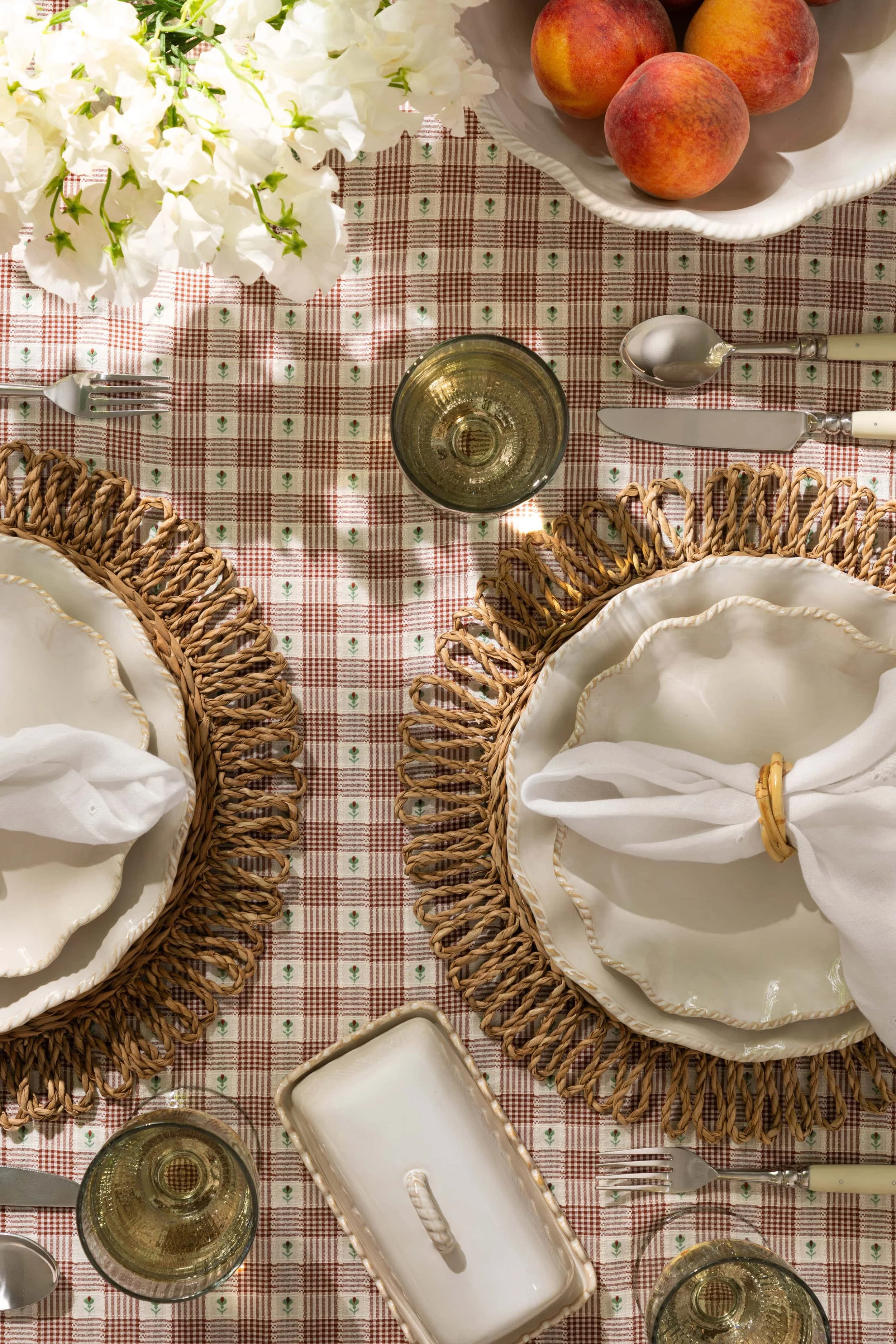 Loeffler Randall collaboration with McGee & Co. Created an artwork for the beautiful tablecloth and pillow yarn dye embroidered fabrication.